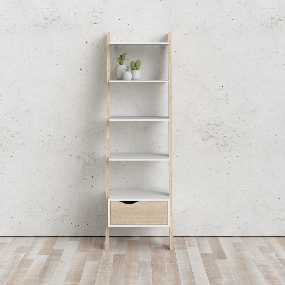 Scaffale libreria in truciolare a forma di scala a 5 ripiani con cassetto. Facile da montare e da pulire. Dimensioni 55,1 x 48,1 x h 180,4 cm. Colore bianco e rovere
