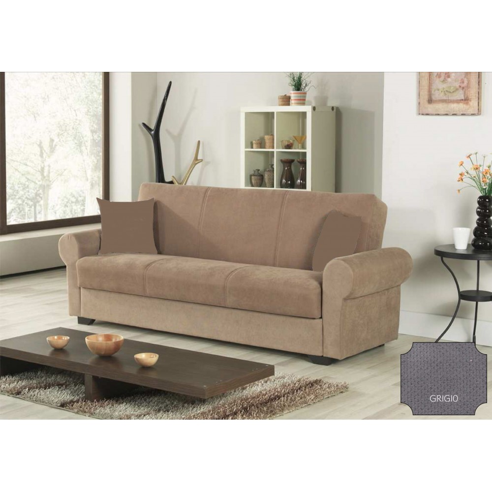 Mod. FIRENZE Divano letto 3/4 posti dalle dimensioni generose, dotato di vano contenitore e rivestimento in tessuto. Confortevole ed elegante che alloccorrenza ribaltando lo schienale si trasforma velocemente in un comodo letto. Dimensioni divano 225 x 86 x h 88 cm. Dimensioni letto 190 x 110 cm. Colore grigio chiaro