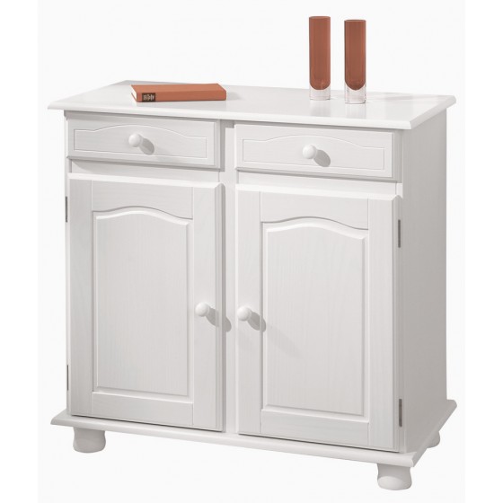Realizzato in legno di pino massiccio, verniciato bianco, con cassetti su guide metalliche. 2 cassetti e 2 grandi porte consentono uno spazio ottimale dove riporre le tue cose. La vernice di finitura ecologica rivela le irregolarità del legno in modo da non alterare la sua naturalezza. Dimensioni 88 x 43 x h 87 cm. Peso 26 kg.