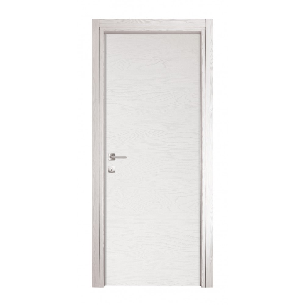 Anta tamburata di spessore nominale 44 mm, riempimento in cartoncino trattato, placcato con pannelli in MDF spessore 3/4 mm nobilitato con carta finish. Telaio piatto in MDF di spessore 40 mm con guarnizione di battuta di gomma. Coprifilo telescopici esterno ed interno in Mdf da 60 mm con aletta utile da 8 mm. Ferramenta serratura mediana. Anuba reversibili. Dimensioni 210x70 cm. Colore frassino bianco.