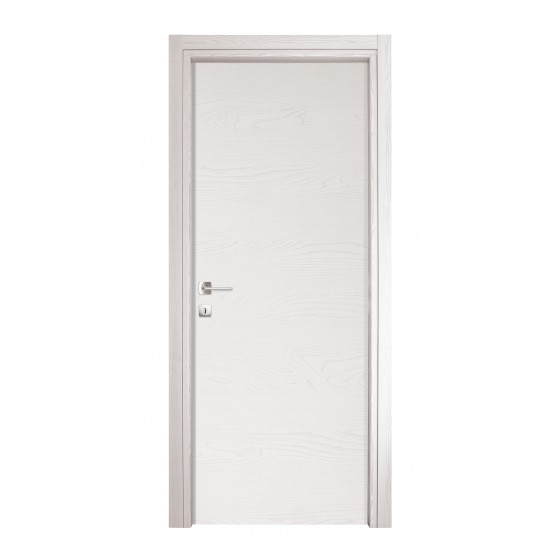 Anta tamburata di spessore nominale 44 mm, riempimento in cartoncino trattato, placcato con pannelli in MDF spessore 3/4 mm nobilitato con carta finish. Telaio piatto in MDF di spessore 40 mm con guarnizione di battuta di gomma. Coprifilo telescopici esterno ed interno in Mdf da 60 mm con aletta utile da 8 mm. Ferramenta serratura mediana. Anuba reversibili. Dimensioni 210x80 cm. Colore frassino bianco