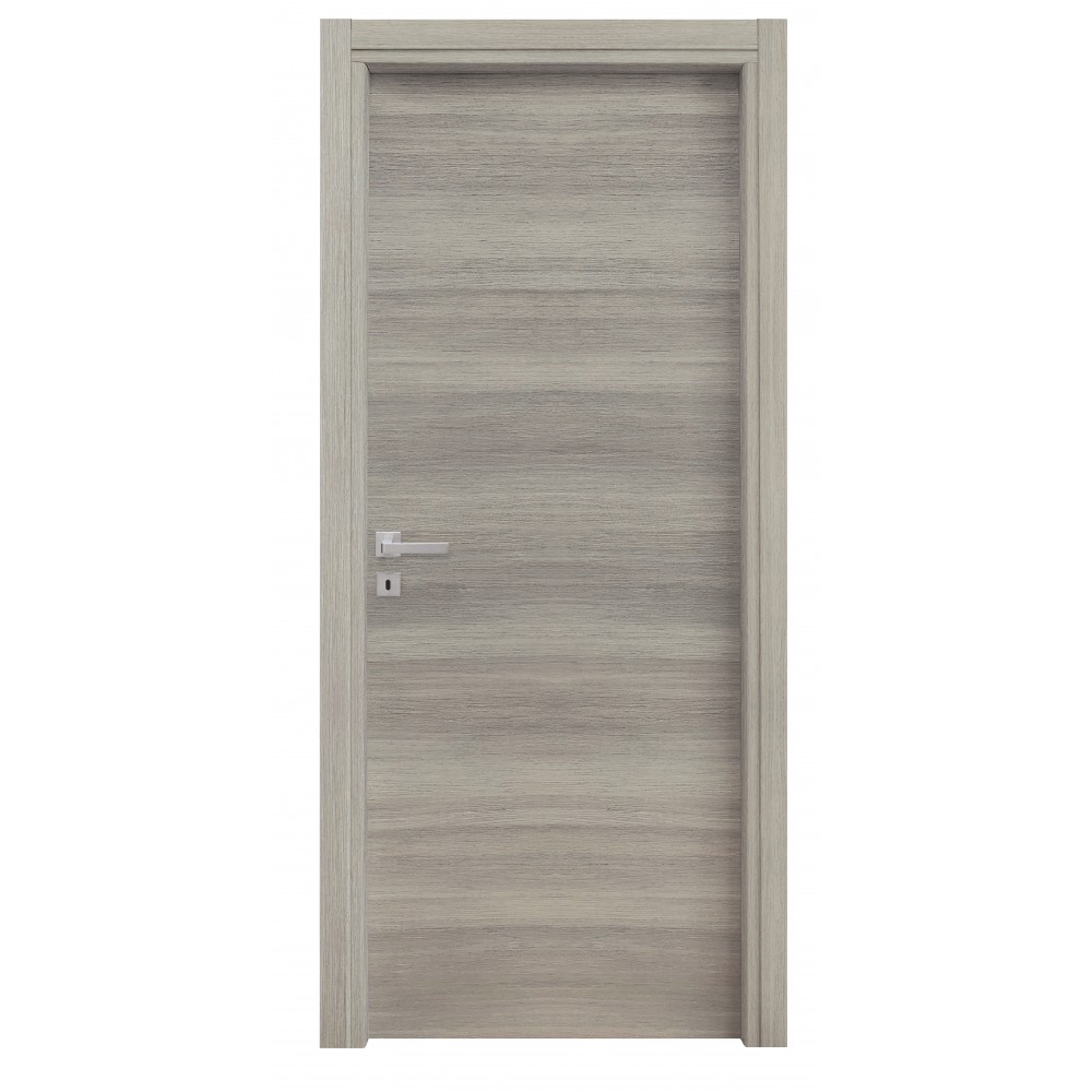 Anta tamburata di spessore nominale 44 mm, riempimento in cartoncino trattato, placcato con pannelli in MDF spessore 3/4 mm nobilitato con carta finish. Telaio piatto in MDF di spessore 40 mm con guarnizione di battuta di gomma. Coprifilo telescopici esterno ed interno in Mdf da 60 mm con aletta utile da 8 mm. Ferramenta serratura mediana. Anuba reversibili. Dimensioni 210x70 cm. Colore rovere grigio.