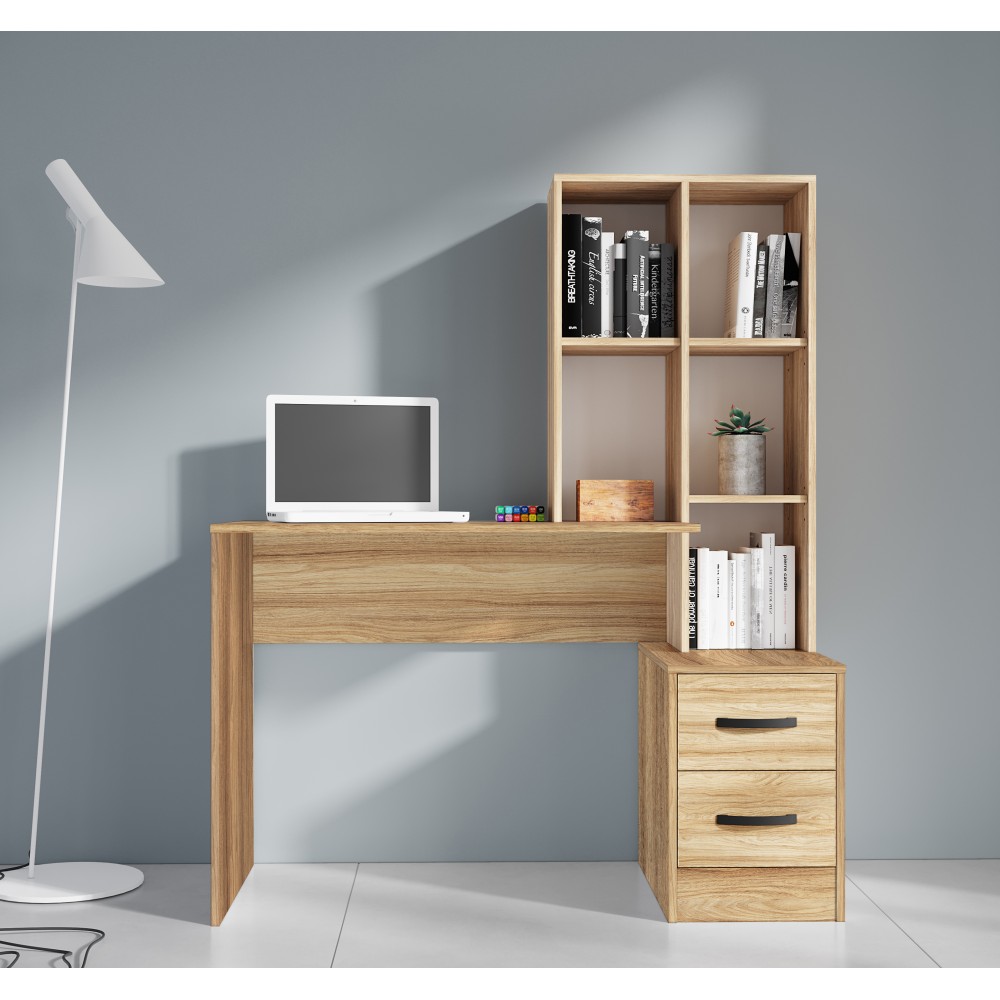 Struttura in truciolare rivestito, dispone di una comoda libreria/scrivania a 5 vani con cassettiera formata da due cassetti e le comode maniglie completano il design del prodotto. Facile da montare. Dimensioni 117 x 50 x h 143 cm. Colore rovere barly.