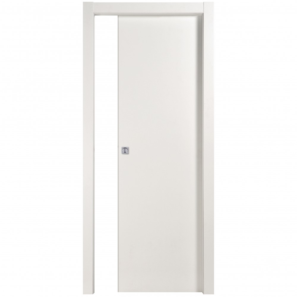 Anta tamburata con telaio perimetrale compreso di rinforzi in massello di abete. Riempimento in cartoncino trattato. Piani in MDF nobilitato con microlaminato. Bordatura sui 4 lati in melaminico. Spessore mm 40. Telaio traverso e montante composto da MDF. Rivestimento con microlaminato. Guarnizione di battuta in gomma e spazzolini neri. Coprifilo esterno ed interno in MDF da 65 mm spessore 10 mm per fasce laterali e spessore 8 mm per fasce trasversali con aletta telescopica, rivestimento con microlaminato. Ferramenta serratura montata, finitura verniciata silver. Kit composto da viti, contropiastra silver. Nottolino fornito a richiesta. Dimensioni 210 x 70 cm Colore bianco