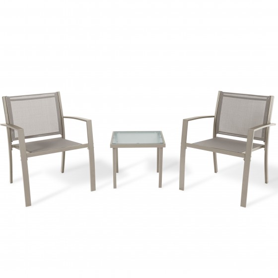 struttura in acciaio marrone taupe. Seduta e schienale in textilene marrone chiaro resistente agli agenti esterni. Composto da 2 poltrone con seduta 58 x 58 x h 75 cm e 1 tavolino da caffe 44 x 44 x h 38 cm con vetro temperato spessore 5 mm.
