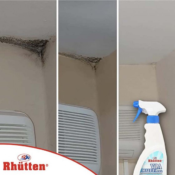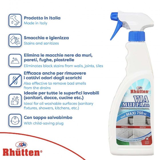 L'antimuffa "VIA MUFFA" RHÜTTEN è un detergente igienizzante cloroattivo ad azione rapida. Ideale per rimuovere macchie scure provocate dall'umidità su muri, fughe e superfici piastrellate. Adatto anche su tutte le superfici lavabili in generale (sanitari, docce, wc, piscine). Azione igienizzante. Seguire attentamente le istruzioni riportate sulla confezione. Flacone 750 ml.