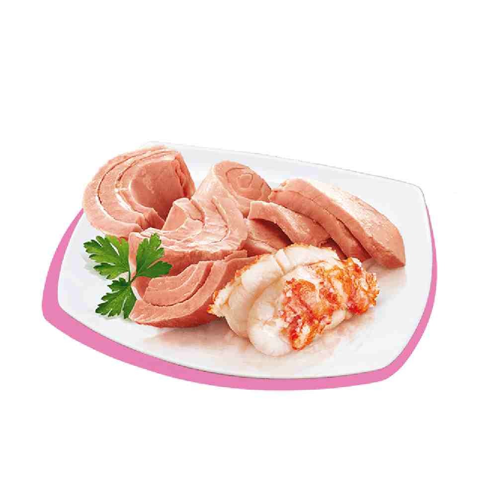- composizione: filetto di tonno 63,5%, surimi 7,5%, farina di riso 1%, sostanze minerali.