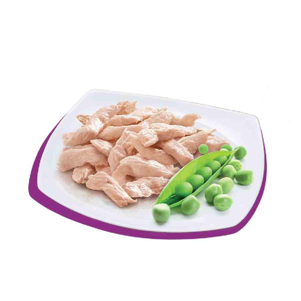 - composizione: petto di pollo 62%, piselli 5,8%,amido di tapioca, farina di riso 1%.