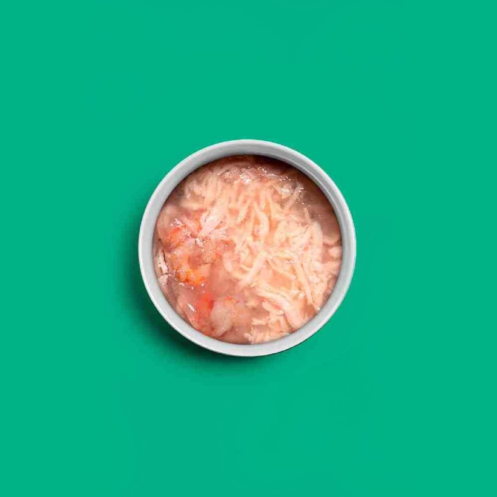 - composizione: pollo 65%, gamberi 5%, gelificanti 1,3%, acqua 28,77%;