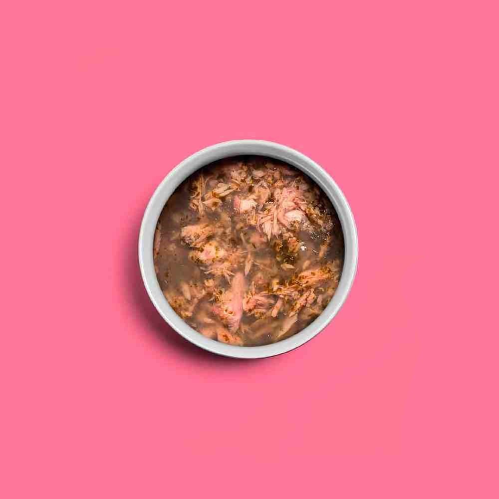 - composizione: tonno 55%, alghe 1%, gelificanti 1,4%, acqua 42,6%;