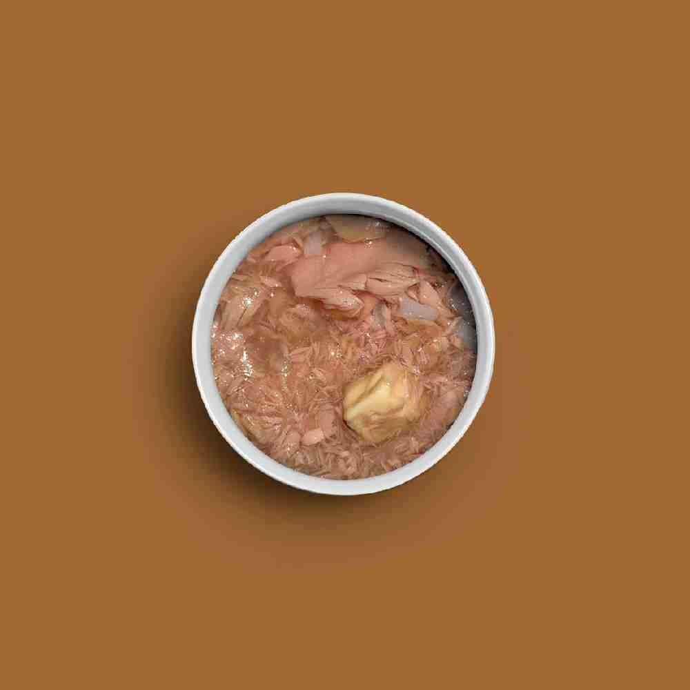 - composizione: tonno 60%, formaggio 5%, riso 1%, acqua 34%, ;