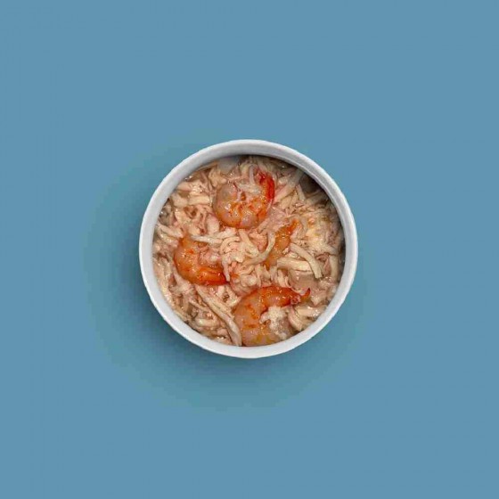 - composizione: pollo 65%, gamberi 5%, riso 1%, acqua 29%, ;